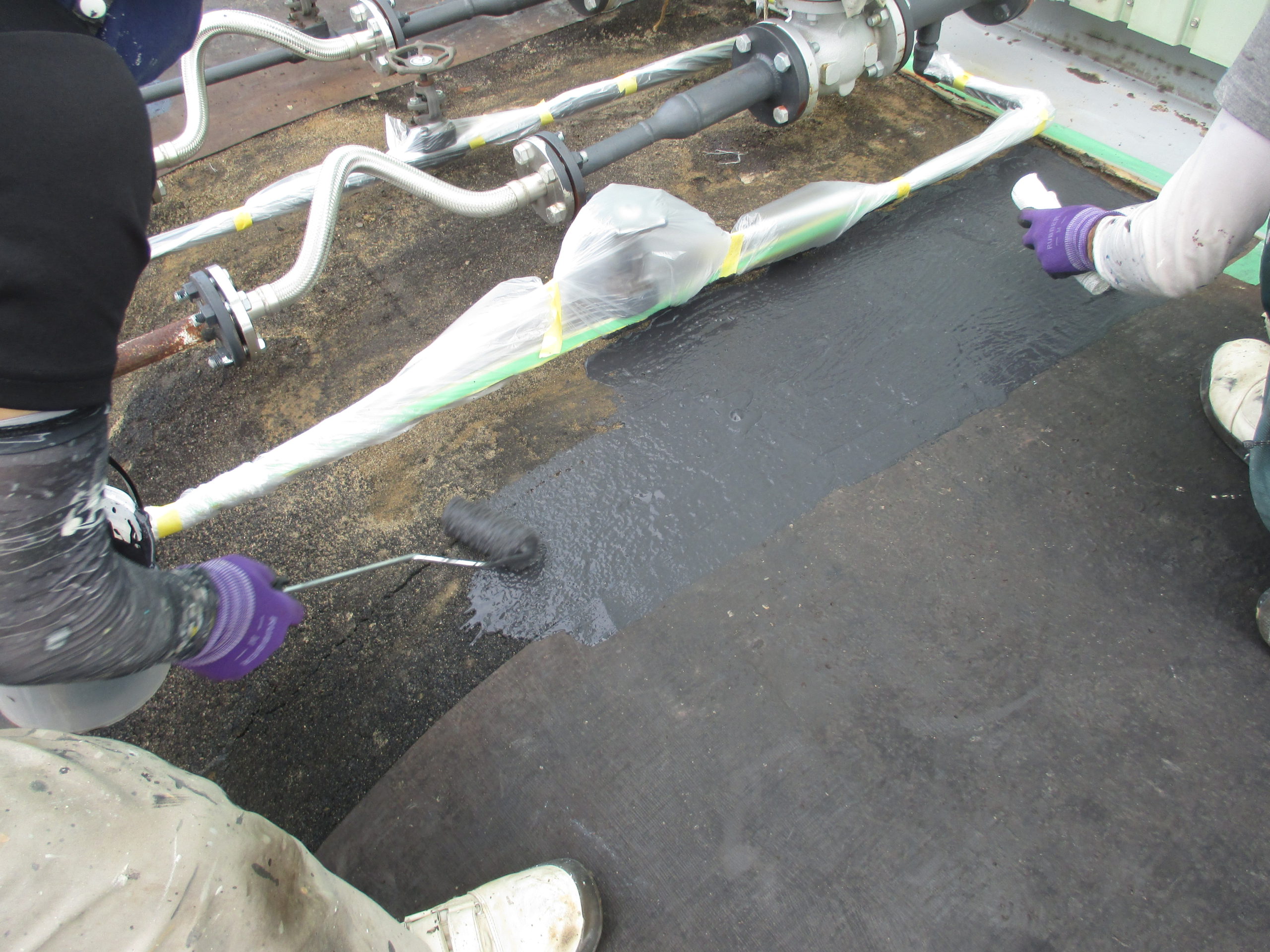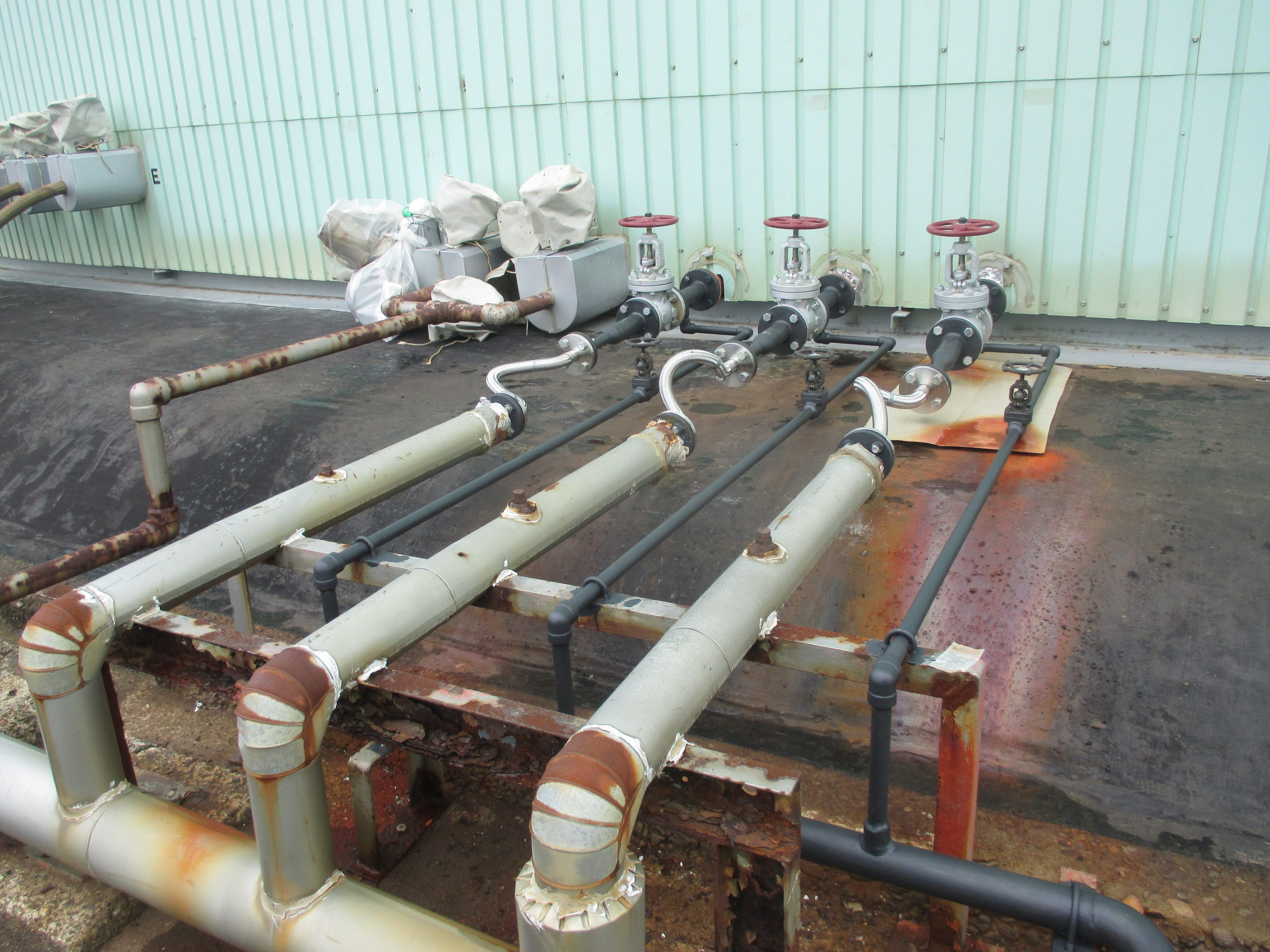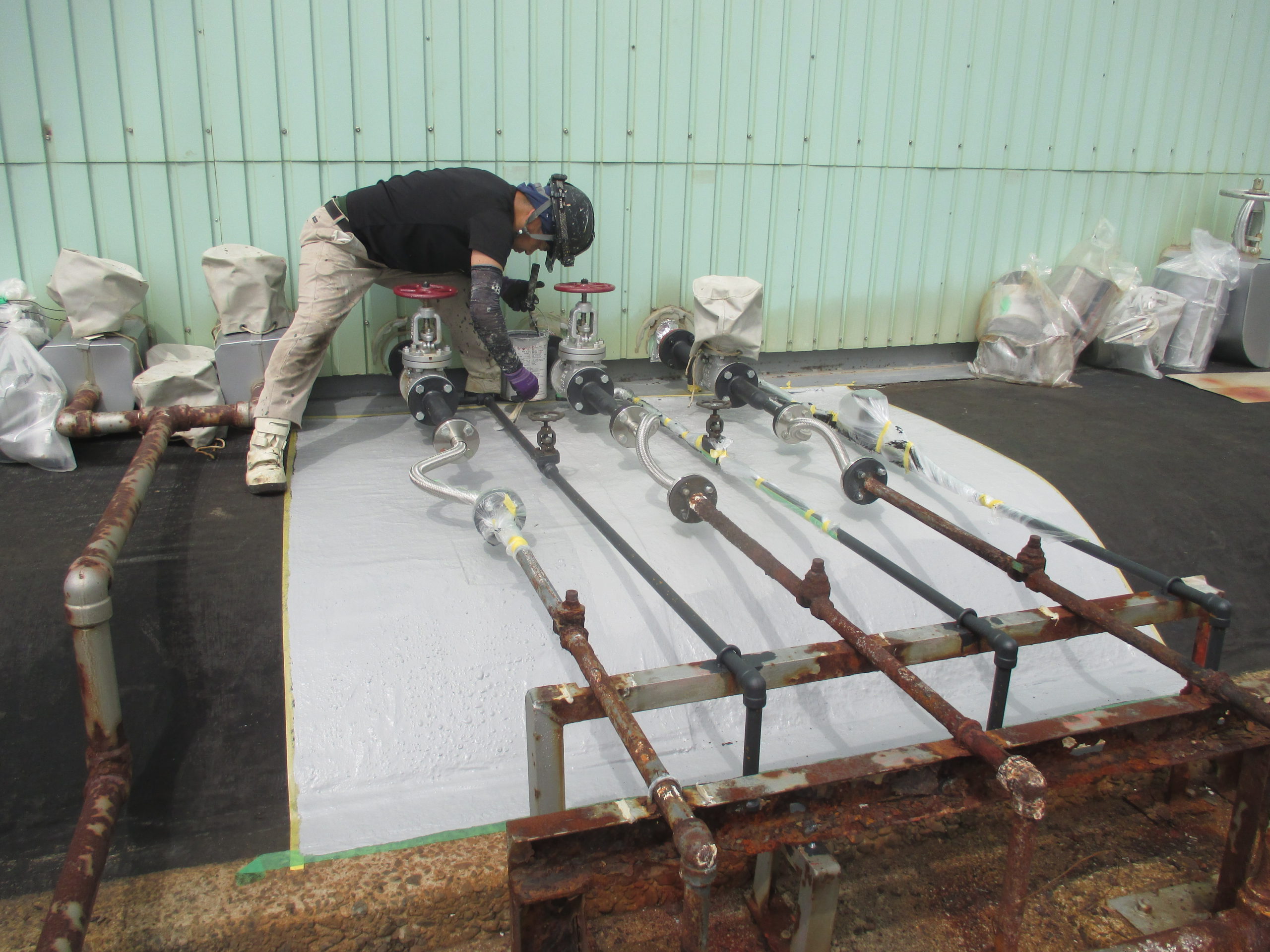 燃料タンク土台の法面に対し、防食補修工事を実施しました。法面上部の蒸気配管の接合部が緩み、漏れた蒸気が法面に直接当たったことで劣化が進行していました。この問題を解消するため、ラスタッフ6410および6420を使用し、法面の防食性能を強化しました。